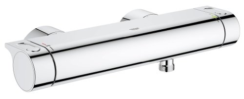 Grohe Thermostat-Brausebatterie Grohtherm 2000 34169001 Wandmontage chrom CoolTouch Sicherheitsgehäuse Leicht zu reinigende StarLight Chromoberfläche TurboStat Kompaktkartusche mit Dehnstoff-Thermoelement Die EcoJoy Technologie sorgt für einen reduzierten Wasserverbrauch integrierte Mischwasserabsperrung Carbodur Keramik-Oberteil 1/2',180° Mengengriff mit Grohe EcoButton (Spartaste mit individuell einstellbarem Sparanschlag) SafeStop Sicherheitssperre bei 38 °C Brauseabgang unten 1/2' eingebaute Rückflussverhinderer Schmutzfangsiebe verdeckte S-Anschlüsse Eigensicher gegen Rückfließen