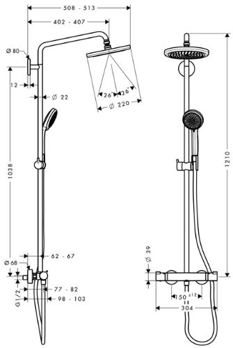 Hansgrohe Croma 220 Showerpipe EcoSmart Brausearm 400 mm schwenkbar Hersteller-Nummer = 27188000 bestehend aus: Kopfbrause Croma Ø 220 mm EcoSmart mit AirPower Technologie und QuickClean (# 26465000) Brausenarm 400 mm schwenkbar Handbrause Croma 100 Vario EcoSmart (# 28537000) Brausenhalter, höhenverstellbar Isiflex Brausenschlauch 1,60 m DN15 (# 28276000) Thermostat mit Sicherheitssperre bei 40°C · Heißwasserbegrenzung, voreinstellbar · Ab-/Umstellventil für Kopfbrause/Handbrause · Stichmaß 150 mm ± 12 mm · S-Anschluss mit Schalldämpfer Durchflussmenge bei 0,3 MPa: · Kopfbrause ca. 9 l/min · Handbrause ca. 9 l/min mit Fliesenausgleichsscheibe 8 mm (# 98681000)